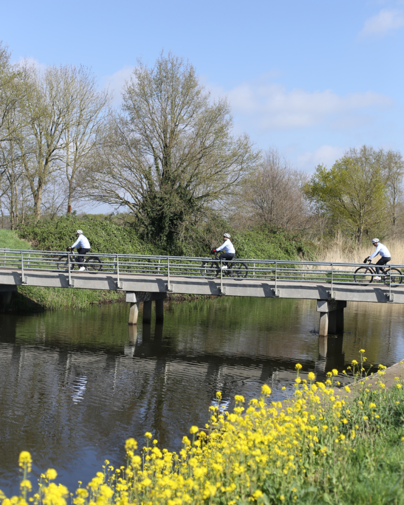 A cada pedalada, o cenário se revela em camadas: campos extensos, cercas de madeira, pequenas pontes sobre canais, casas com jardins floridos, aldeias que surgem sem aviso. Por isso, não há transições abruptas, apenas a continuidade tranquila de um território que funciona. A paisagem holandesa foi moldada pela ocupação humana ao longo dos séculos, com diques, moinhos e lavouras organizadas que não apenas embelezam o caminho, mas sustentam a vida ali.