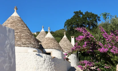 Pedal em loop pelos campos do Vale d’Itria. Parada em Alberobello, Patrimônio Mundial da UNESCO, para caminhar entre os trulli e explorar os ateliês locais. O trajeto passa por Fasano e Locorotondo.